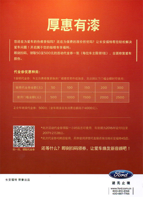 即刻掃碼,領(lǐng)取50至500元的活動(dòng)代金券一張(每位車主限領(lǐng)1張),全面修復(fù)愛車損傷。