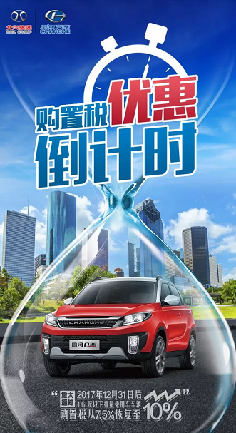 2017年12月31日前,購買1.6L及以下北汽昌河車型,按7.5%的稅率征收車輛購置稅。2018年1月1日起,將恢復按10%的法定稅率征收車輛購置稅。從即日起至2017年12月31日,扣除休息日,僅剩23天。