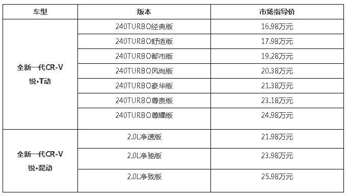 7月9日,東風(fēng)Honda全新一代CR-V在極具生活氣息的成都心動(dòng)上市,同時(shí)推出SPORT TURBO(銳·T動(dòng))和SPORT HYBRID(銳·混動(dòng))兩種版本共10款車(chē)型。其中:全新一代CR-V 銳·T動(dòng)共推出7款車(chē)型,市場(chǎng)指導(dǎo)價(jià)16.98-24.98萬(wàn)元;全新一代CR-V 銳·混動(dòng)為全球首次上市,共推出3款車(chē)型,市場(chǎng)指導(dǎo)價(jià)21.98-25.98萬(wàn)元。